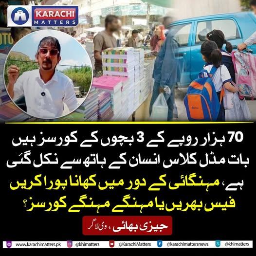 سوشل میڈیا کانٹینٹ کریئٹر جیزی بھائی نے ایک ویڈیو پیغام شیئر کرتے ہوئے کہا ہے کہ 70 ہزار روپے کے 3 بچوں کے کورسز ہیں! کس طریقے سے بھریں گے؟ اس مہنگائی کے دور میں کھانا پورا کریں یا مہنگے مہنگے کورسز اور فیس بھریں، بات اب مڈل کلاس انسان کے ساتھ سے باہر نکل چکی ہے، غریب کا بچہ کس طرح پڑھے گا
